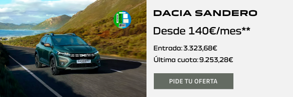 **Oferta válida en Península y Baleares para particulares y autónomos que realicen un pedido del 01/01/2025 al 31/01/2025 de un SANDERO STEPWAY, siempre que financien a través de preference con RCI Banque SA, Sucursal en España. Precio al contado: 15.320,00€. Ejemplo de financiación para SANDERO STEPWAY Essential 74kW (100CV) ECO-G . PVP financiando: 14.120,00€. Entrada: 3.323,68€. Importe a financiar: 11.704,09€. 36 cuotas de 140€ al mes y una última cuota de 9.253,28€. Comisión de Apertura (al contado): 362,83€ (3,10%). Intereses: 2.589,19€. Coste total del crédito: 2.952,02€. Importe Total Adeudado: 14.656,11€. Precio total a plazos: 17.979,79€. TIN: 8,00%. TAE: 9,69% El mantenimiento y la protección de pagos no forman parte del coste de la financiación a efectos del cálculo de la TAE. El importe a financiar incluye protección de pagos opcional (398,64€) y el mantenimiento opcional (509,13€) preconizado por la marca durante 3 años o 50.000km (la condición que suceda antes). Sistema de amortización francés. La oferta incluye IVA, impuesto de matriculación, transporte y descuentos promocionales. Permanencia mínima de 36 meses. El importe mínimo a financiar será el de mayor cuantía entre 6.000€ o el importe de la última cuota. Sujeto a kilometraje máximo de 15.000kms/año. Incompatible con otras acciones financieras. El modelo visualizado puede no coincidir con el ofertado. Consulta condiciones en tu concesionario Dacia o