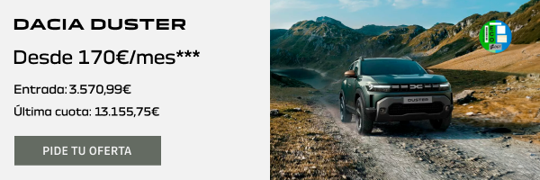 ***Oferta válida en Península y Baleares para particulares y autónomos que realicen un pedido del 01/01/2025 al 31/01/2025 de un NUEVO DUSTER, siempre que financien a través de preference con RCI Banque SA, Sucursal en España. Precio al contado: 19.490,00€. Ejemplo de financiación para NUEVO DUSTER Essential TCe 74kw (100CV) ECO-G 4x2. PVP financiando: 18.242,89€. Entrada: 3.570,99€. Importe a financiar: 15.713,34€. 36 cuotas de 170€ al mes y una última cuota de 13.155,75€. Comisión de Apertura (al contado): 487,11€ (3,10%). Intereses: 3.562,41€. Coste total del crédito: 4.049,52€. Importe Total Adeudado: 19.762,86€. Precio total a plazos: 23.333,85€. TIN: 8,00%. TAE: 9,66%. El mantenimiento y la protección de pagos no forman parte del coste de la financiación a efectos del cálculo de la TAE. El importe a financiar incluye protección de pagos opcional (535,20€) y el mantenimiento opcional (506,24€) preconizado por la marca durante 3 años o 50.000km (la condición que suceda antes). Sistema de amortización francés. La oferta incluye IVA, impuesto de matriculación, transporte y descuentos promocionales. Permanencia mínima de 36 meses. El importe mínimo a financiar será el de mayor cuantía entre 6.000€ o el importe de la última cuota. Sujeto a kilometraje máximo de 15.000kms/año. Incompatible con otras acciones financieras. El modelo visualizado puede no coincidir con el ofertado.